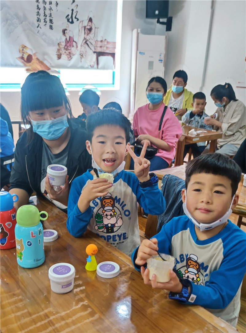 提及冰淇淋,現場的小朋友一個個興奮得歡呼雀躍。商場里出售的冰淇淋中多含有較多的添加劑,如何給孩子制作一款無添加劑的冰淇淋成了這堂親子互動課的目的。群益村美食老師現場講解打發雞蛋及雞蛋牛奶混合液的過程,演示打發淡奶油、攪拌混合,加入果醬等改變口味的方法和分裝小瓶等步驟。期間大家認真聽講解,小朋友們眼睛牢牢地盯著講臺,仔細觀察每一個步驟,還時不時地向美食老師發問,興致高漲。孩子們一邊品嘗著冰淇淋,一邊在自己的冰淇淋罐盒上貼上自己所愛口味的標簽后讓美食老師裝滿剛做的冰淇淋,跑前跑后忙得不亦樂乎!