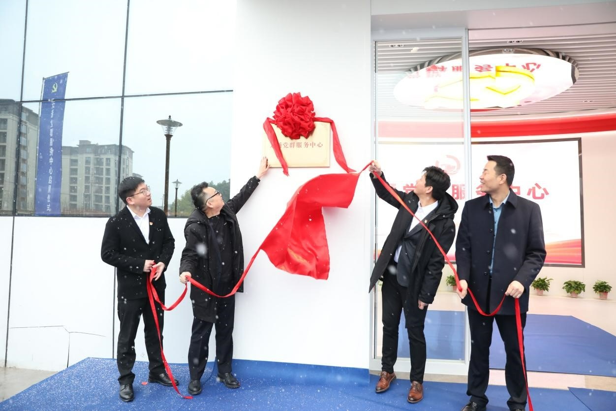 儀式第二階段,與會人員集體移步至黨群服務中心展廳。在天通黨員的共同見證下,彭林軍、呂忠飛、江超、潘建清四位領導一起為黨群服務中心揭牌,宣布天通黨群服務中心正式啟用。